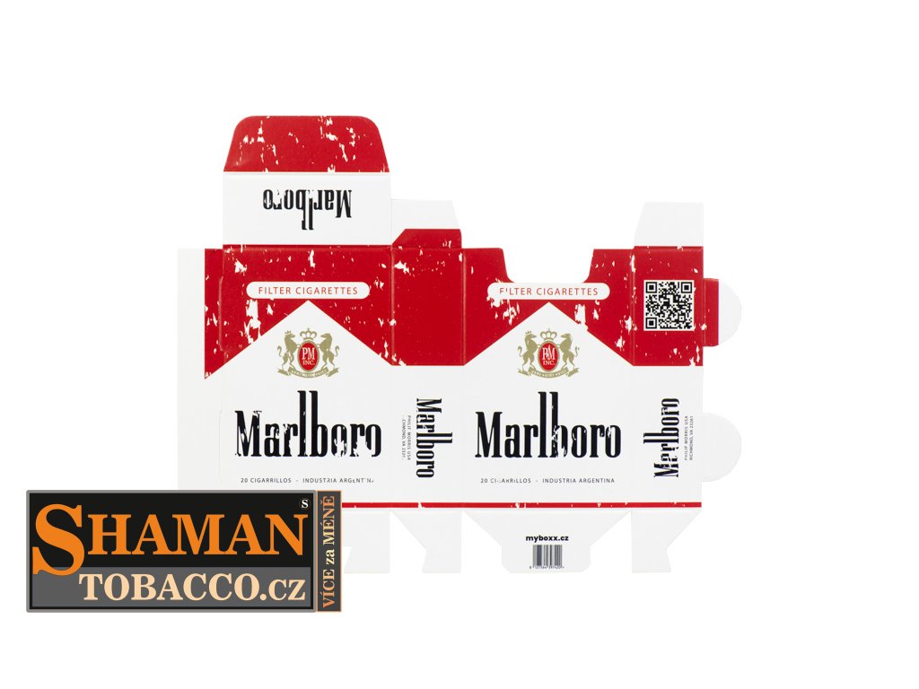 Pevná skládací papírová krabička myBOXX s RETRO motivem MARLBORO RED ANTIQUE slouží jako obal na běžnou velikost cigaretových krabiček.