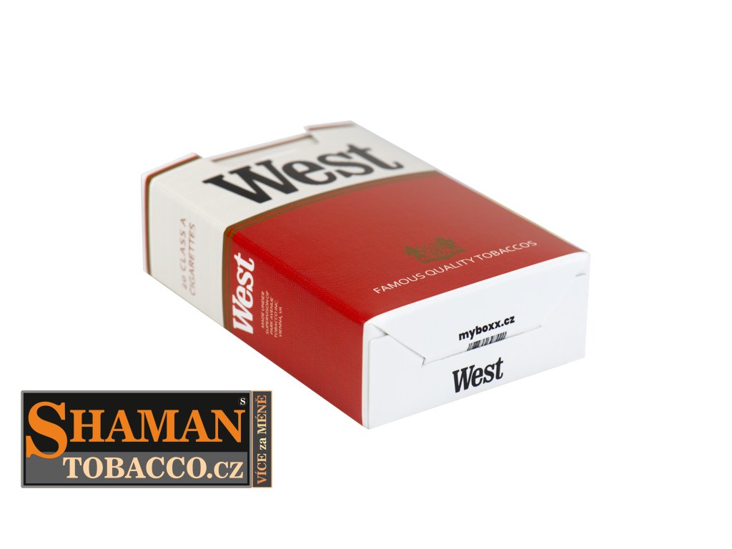 Pevná skládací papírová krabička myBOXX s RETRO motivem WEST RED slouží jako obal na běžnou velikost cigaretových krabiček.