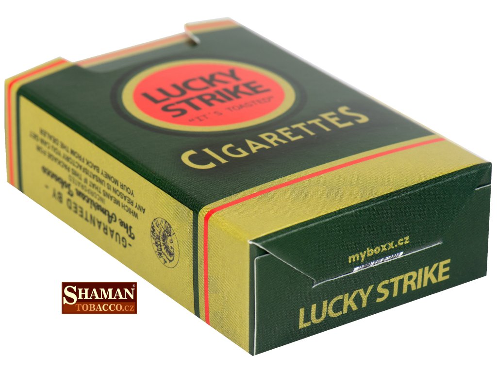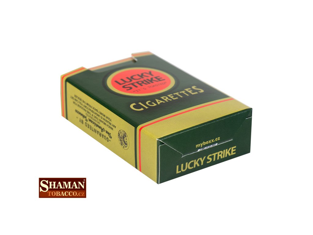 Pevná skládací papírová krabička myBOXX s RETRO motivem LUCKY STRIKE GREEN slouží jako obal na běžnou velikost cigaretových krabiček.