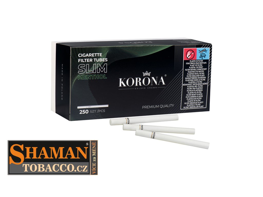 Tenké cigaretové mentolové dutinky Korona Slim Menthol 250 jsou fantastické slim dutinky o průměru 6,8mm, s filtrem dlouhým úctyhodných 18mm.