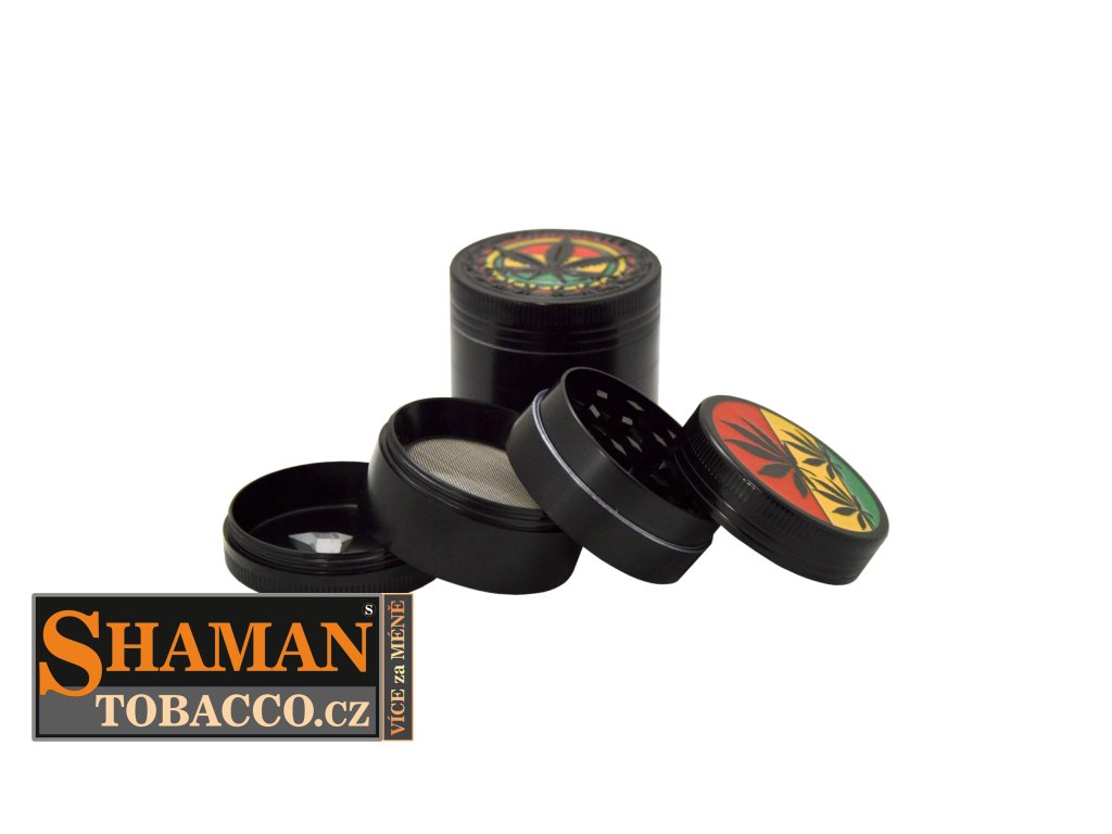 Víko drtičky je uprostřed zdobeno atraktivním konopným listem v černé barvě.