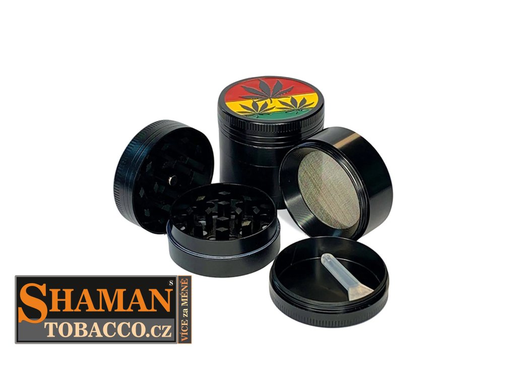 Víko drtičky je uprostřed zdobeno třemi atraktivními konopnými listy v černé barvě.