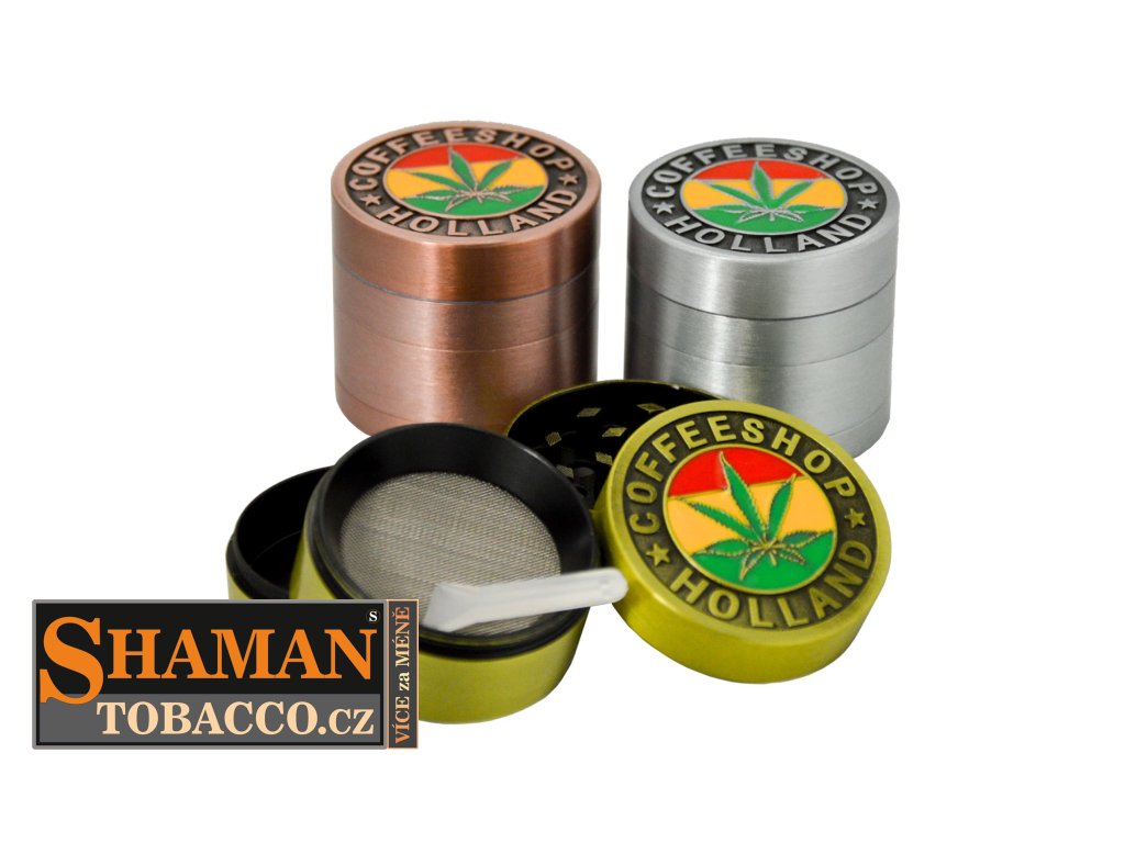 Víko drtičky je na vnější části zdobeno atraktivním nápisem "COFFESHOP HOLLAND" a uprostřed je design konopného listu.