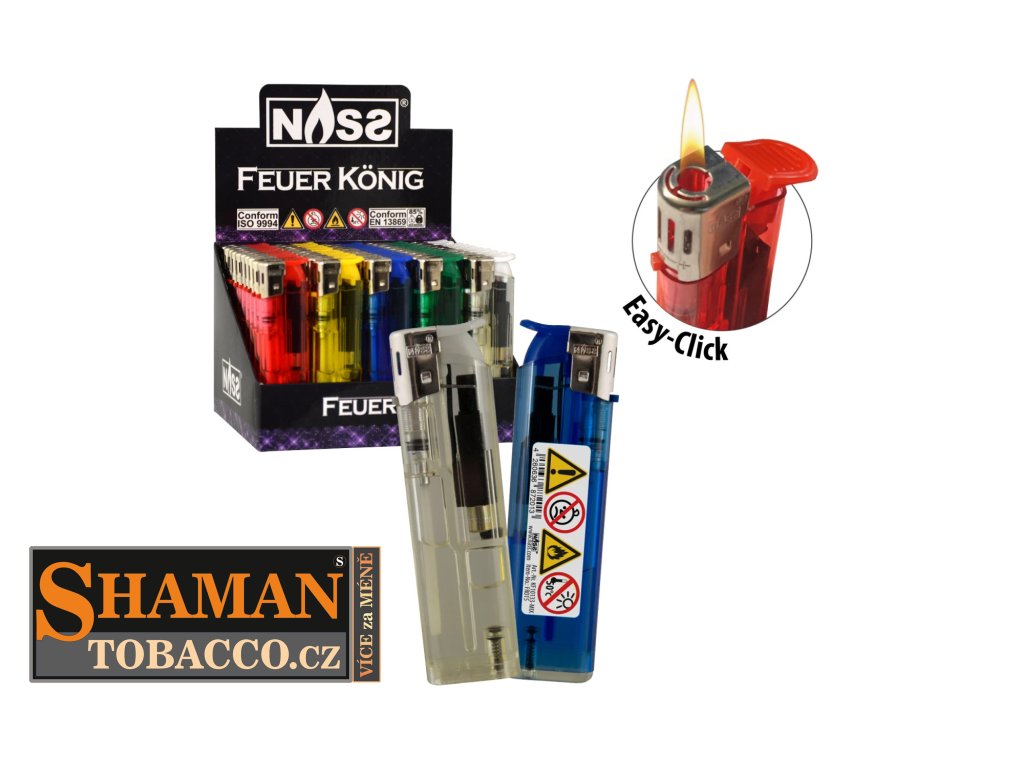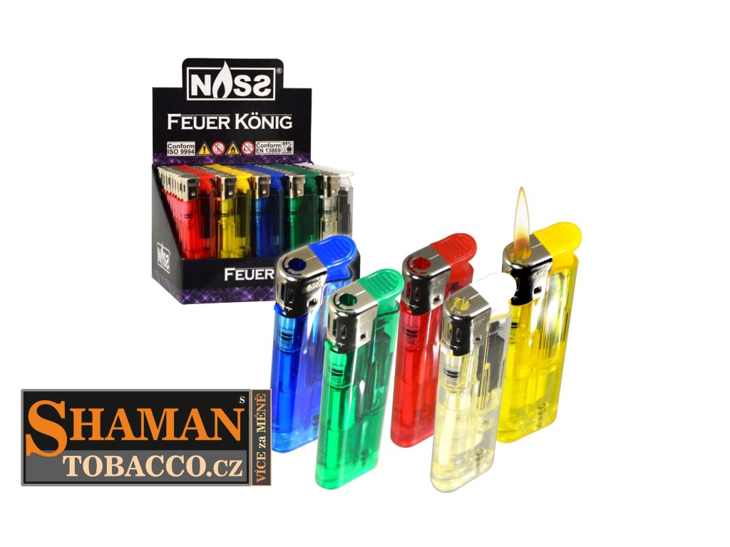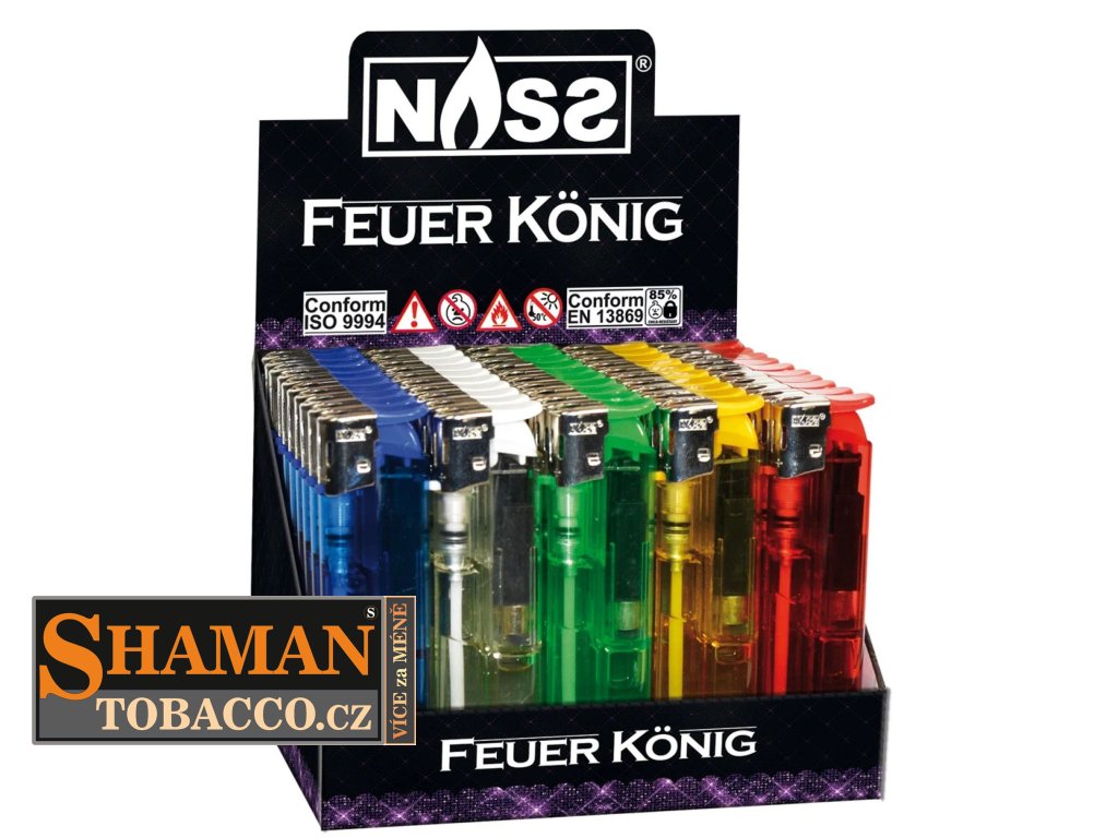 Elektronické (piezzo) plnitelné zapalovače NASS FEUER KOENIG s odklápěcím zapalovacím tlačítkem v obchodním balení po 50-ti ks jsou opravdovou zárukou proslulé německé kvality.