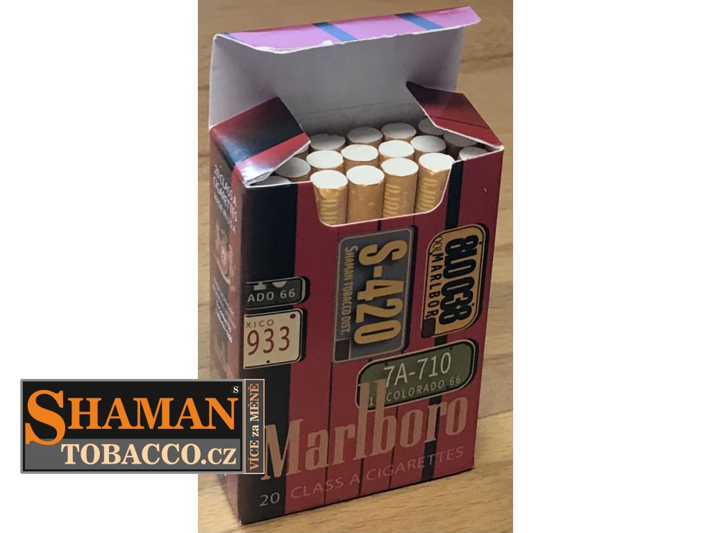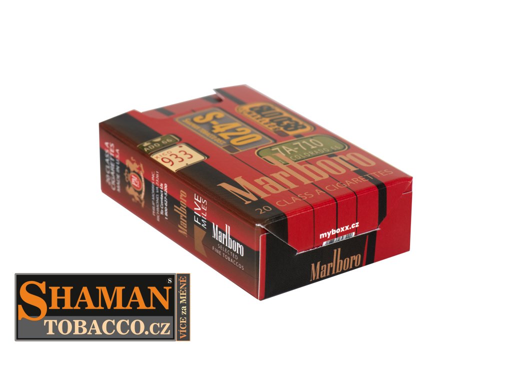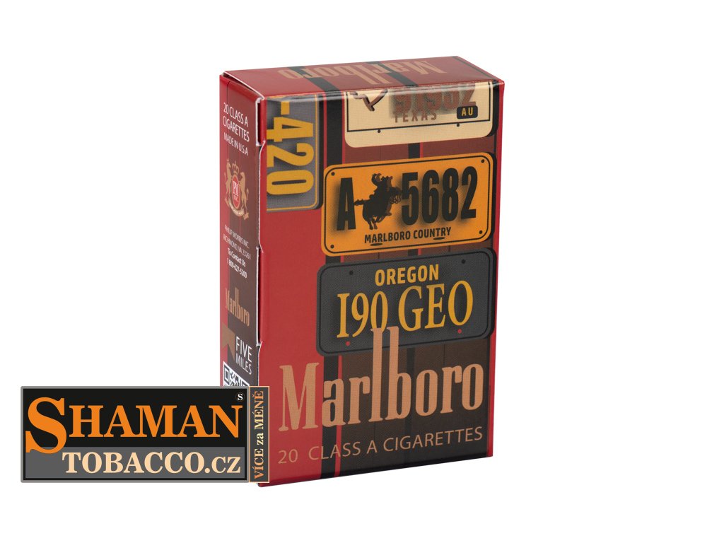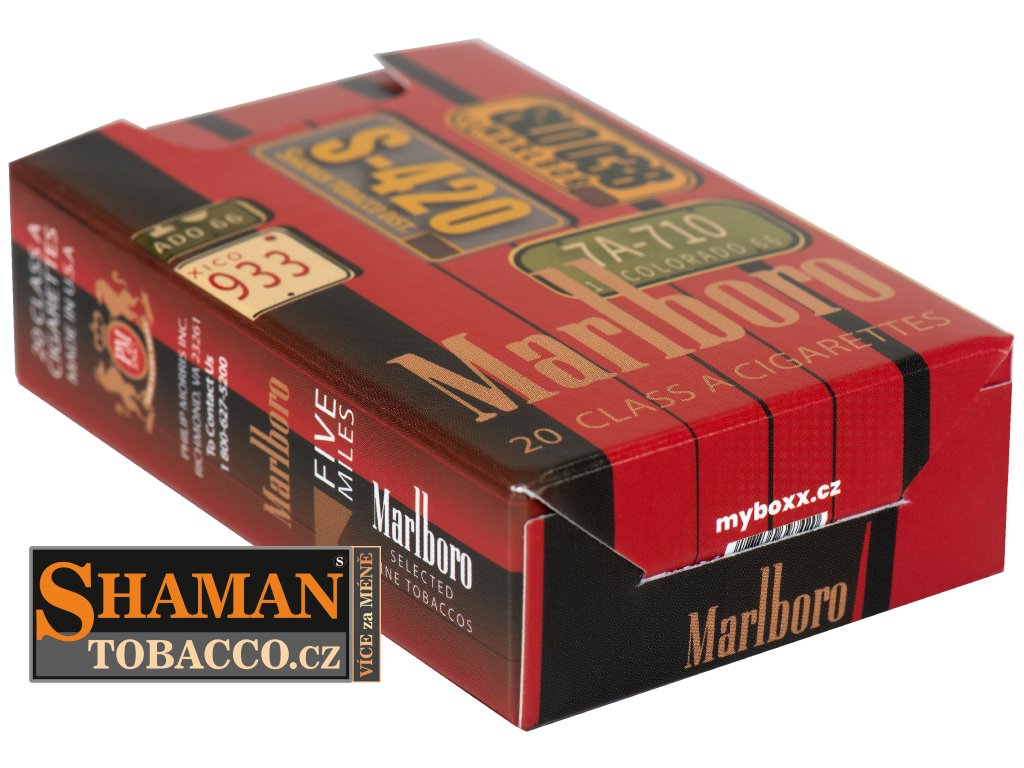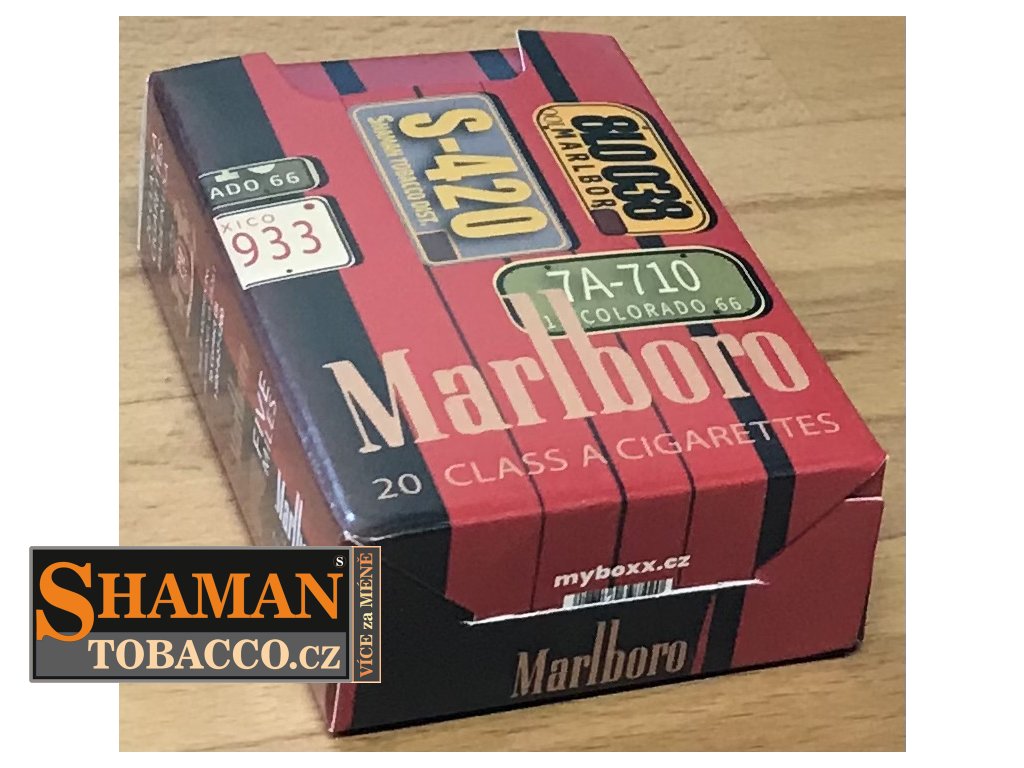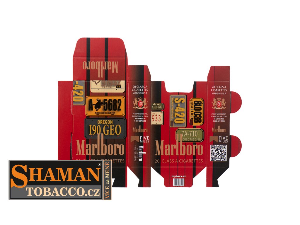Pevná skládací papírová krabička myBOXX s RETRO motivem MARLBORO USA SIGNS slouží jako obal na běžnou velikost cigaretových krabiček.