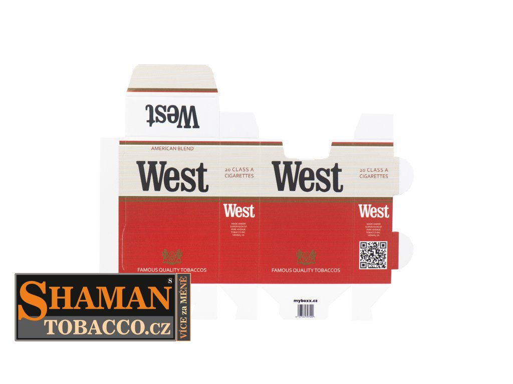 Pevná skládací papírová krabička myBOXX s RETRO motivem WEST RED slouží jako obal pro cigaretové krabičky standardní velikosti.