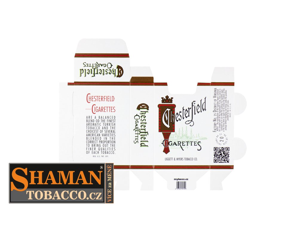 Pevná skládací papírová krabička myBOXX s RETRO motivem CHESTERFIELD RED slouží jako obal na běžnou velikost cigaretových krabiček.