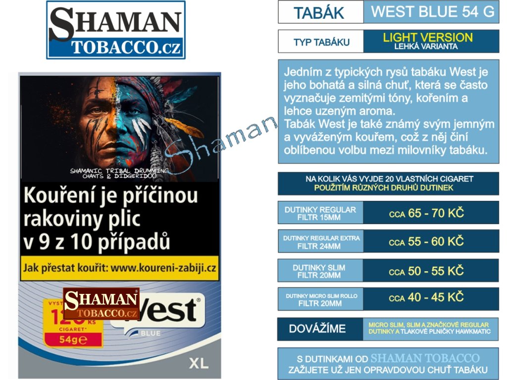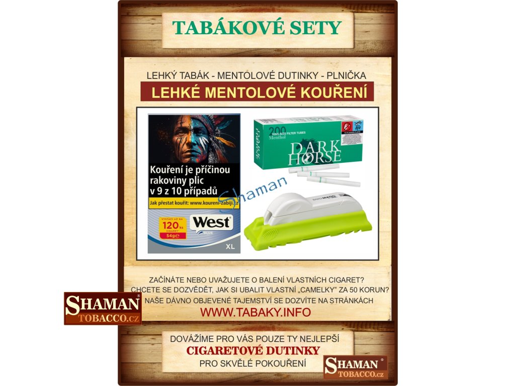 Doporučený tabákový balíček LEHKÉ MENTOLOVÉ KOUŘENÍ obsahuje lehký tabák WEST Blue 54g, oblíbené mentolové lehké bílé dutinky DARK HORSE 200 a manuální plničku OCB DUO (barvu plničky dodáme libovolně dle stávajícího skladu).